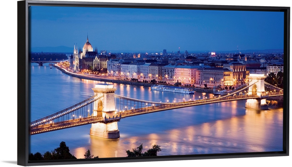 <p>Hungary, Budapest, Budapest, Chain Bridge, Danube,Donau, Danube, Travel Destination, Parliament on the Pest Embankment iIlluminated at dusk</p>