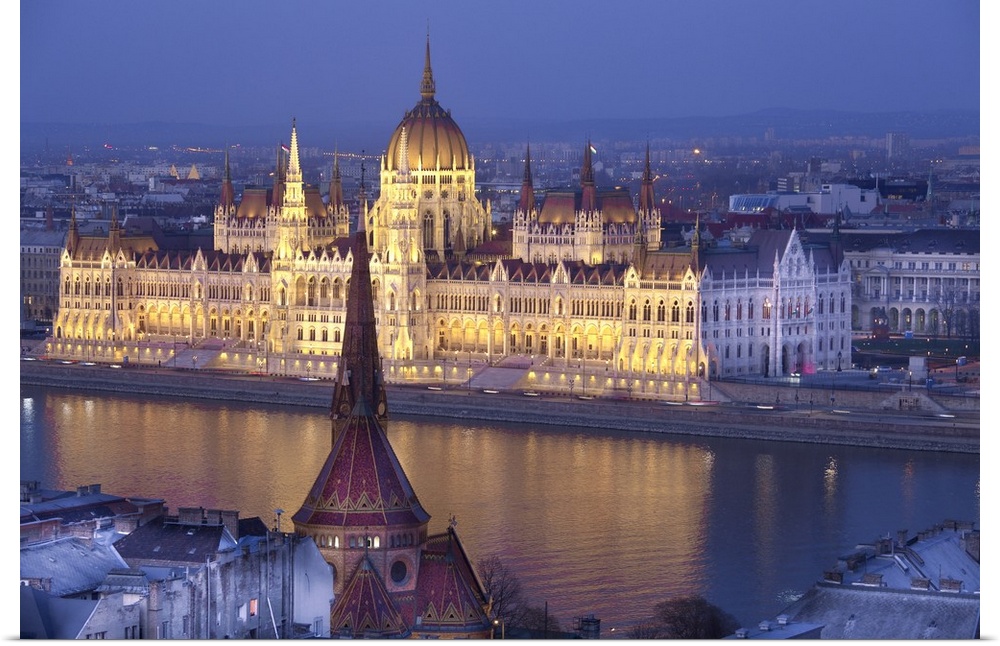 <p>Hungary, Budapest, Parliament Building by Danube River from the Fisherman's Bastion</p>
