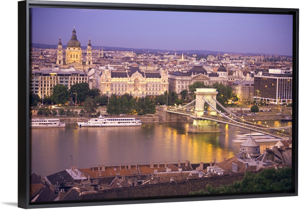 <p>HUNGARY, Budapest. View of the Sz..chenyi Chain Bridge and St. Stephen's Basilica from Castle Hill.</p>