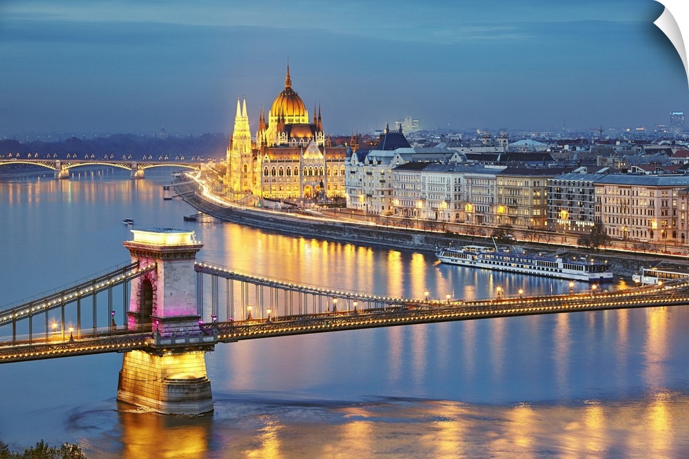 <p>Hungary, Budapest, View of the Danube river, Chain Bridge, Szechenyi Lanchid, and the Parliament building</p>