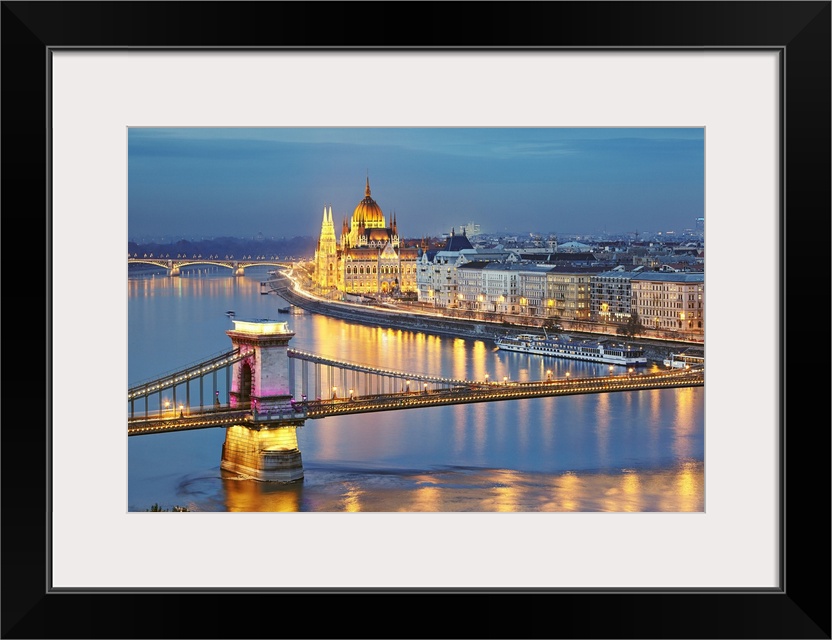 <p>Hungary, Budapest, View of the Danube river, Chain Bridge, Szechenyi Lanchid, and the Parliament building</p>