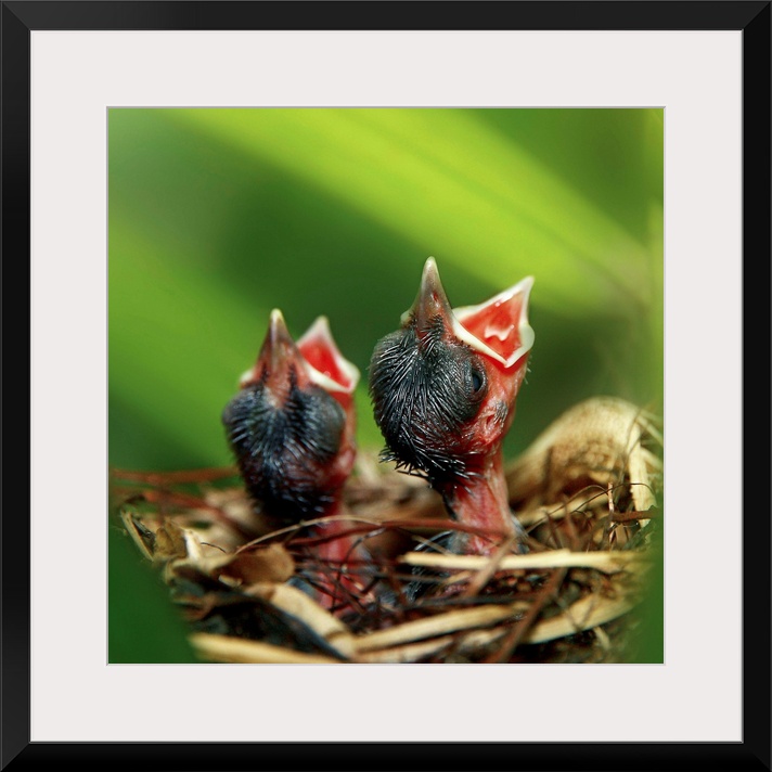<p>Fine art photograph of baby birds in a nest waiting for their mother to return with food.</p>