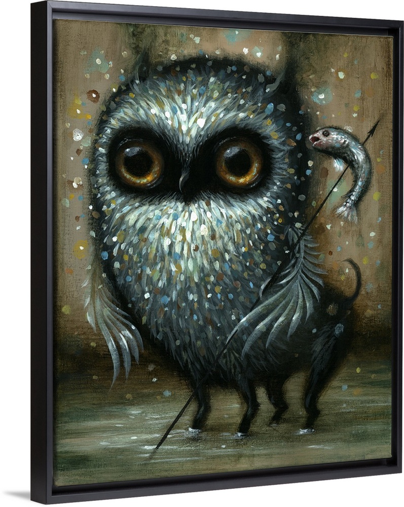 <p>Surrealist painting of an owl with the lower half of it being a four legged animal, while holding a spear with a fish on the end of it.</p>