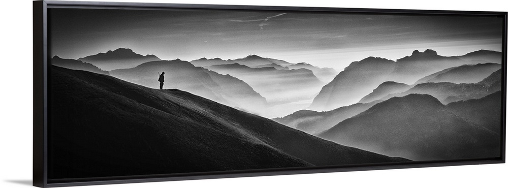 <p>A lone figure stands at the top of a hill, in front of a misty mountain range.</p>