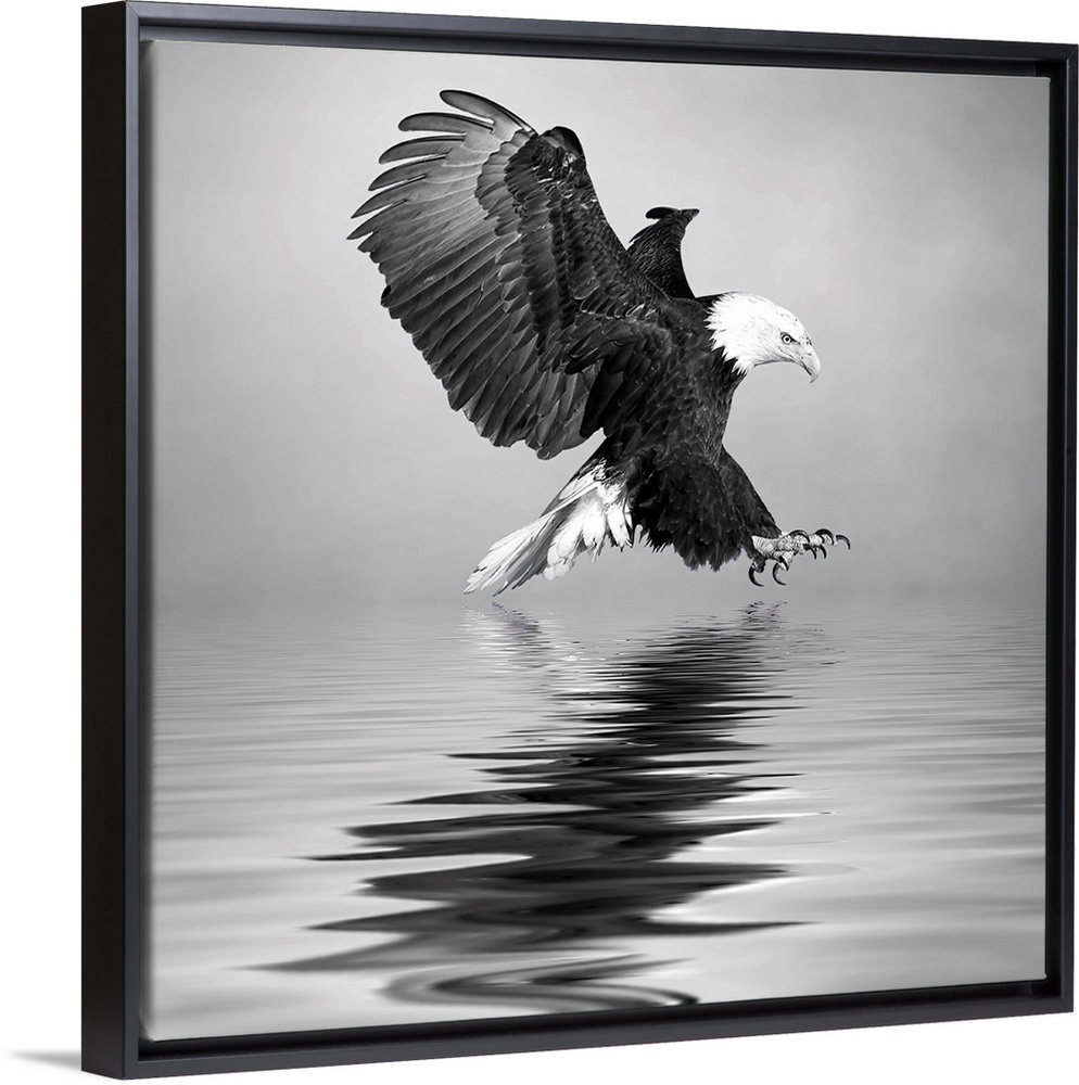 <p>Black and white image of a Bald Eagle swooping down to the water.</p>