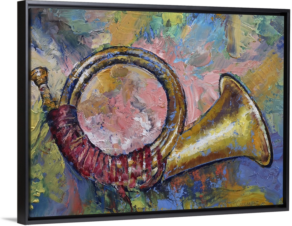 <p>A contemporary painting of a brass horn against a colorful background.</p>