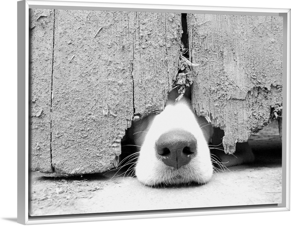 <p>Hunting (blood hound) puppy wants to get out and pokes nose out from under the barn door.</p>