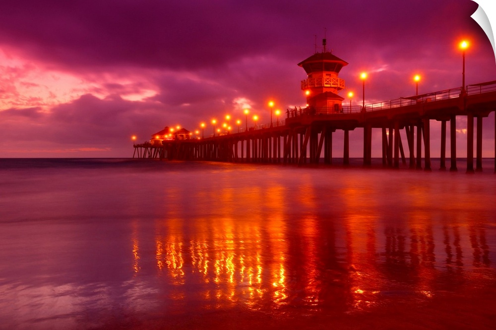 <p>Big horizontal photograph of a lit pier reflecting in the water near Huntington beach at dusk, beneath a vibrant, cloudy sky.</p>