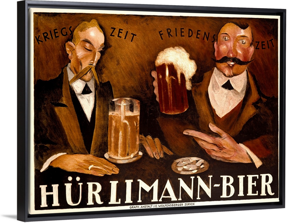 <p>Large vintage art advertisement shows two nicely dressed men enjoying a couple of cold beers at a bar.</p>