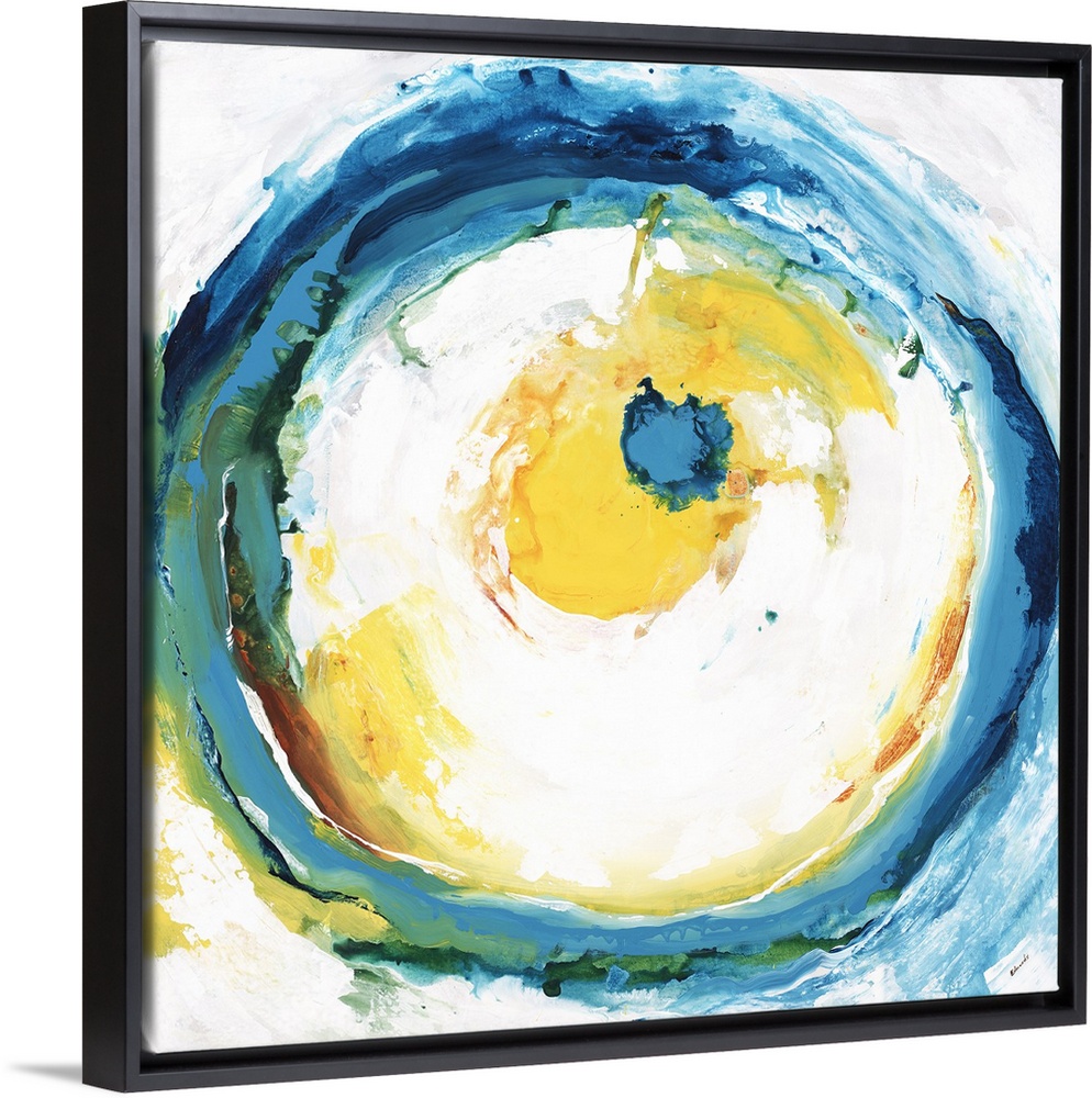 <p>Square abstract artwork with a large circle in the center with blue, green, yellow, and orange brushstrokes on a white and gray background.</p>
