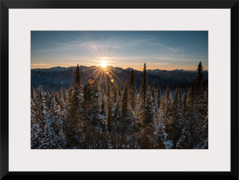 <p>Beam of sun light over snow mountains at Hurricane Ridge, Olympic National Park, during sunset.</p>