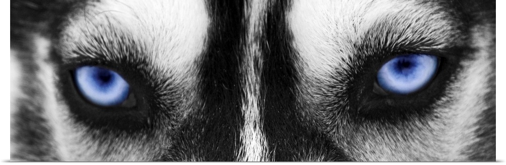 <p>Black and white close up image of the eyes of a husky with the eyes colored blue.</p>