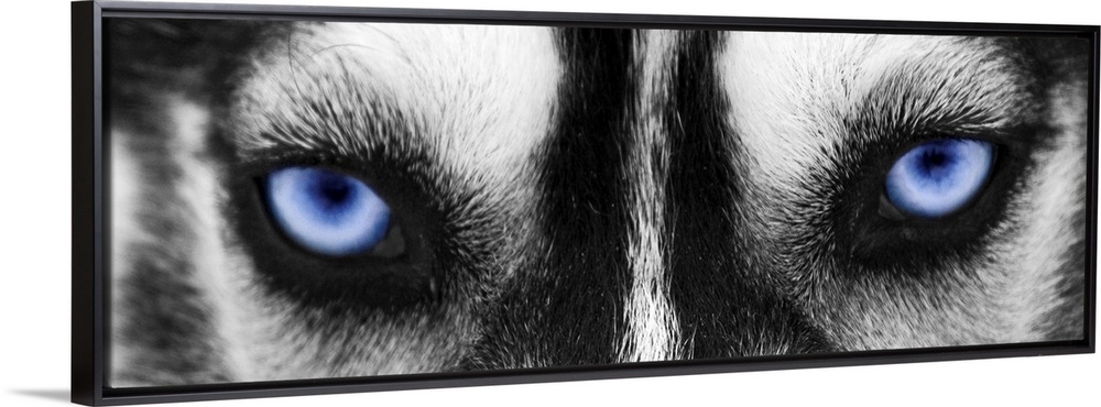 <p>Black and white close up image of the eyes of a husky with the eyes colored blue.</p>