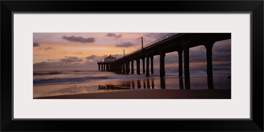 <p>Wide angle photograph of Manhattan Beach Pier extending into the water at sunset, in Los Angeles County, California.</p>