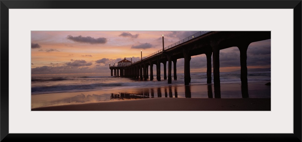 <p>Wide angle photograph of Manhattan Beach Pier extending into the water at sunset, in Los Angeles County, California.</p>