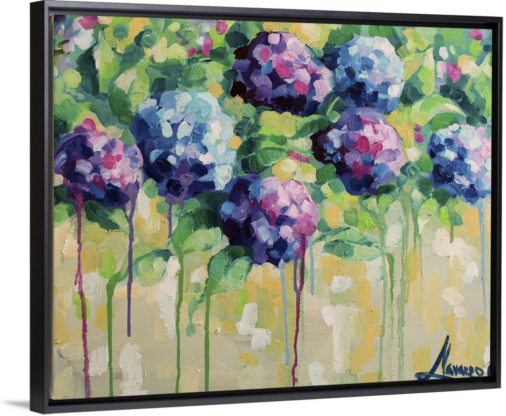 <p>Contemporary paining of colorful hydrangea flowers against a pale yellow background.</p>