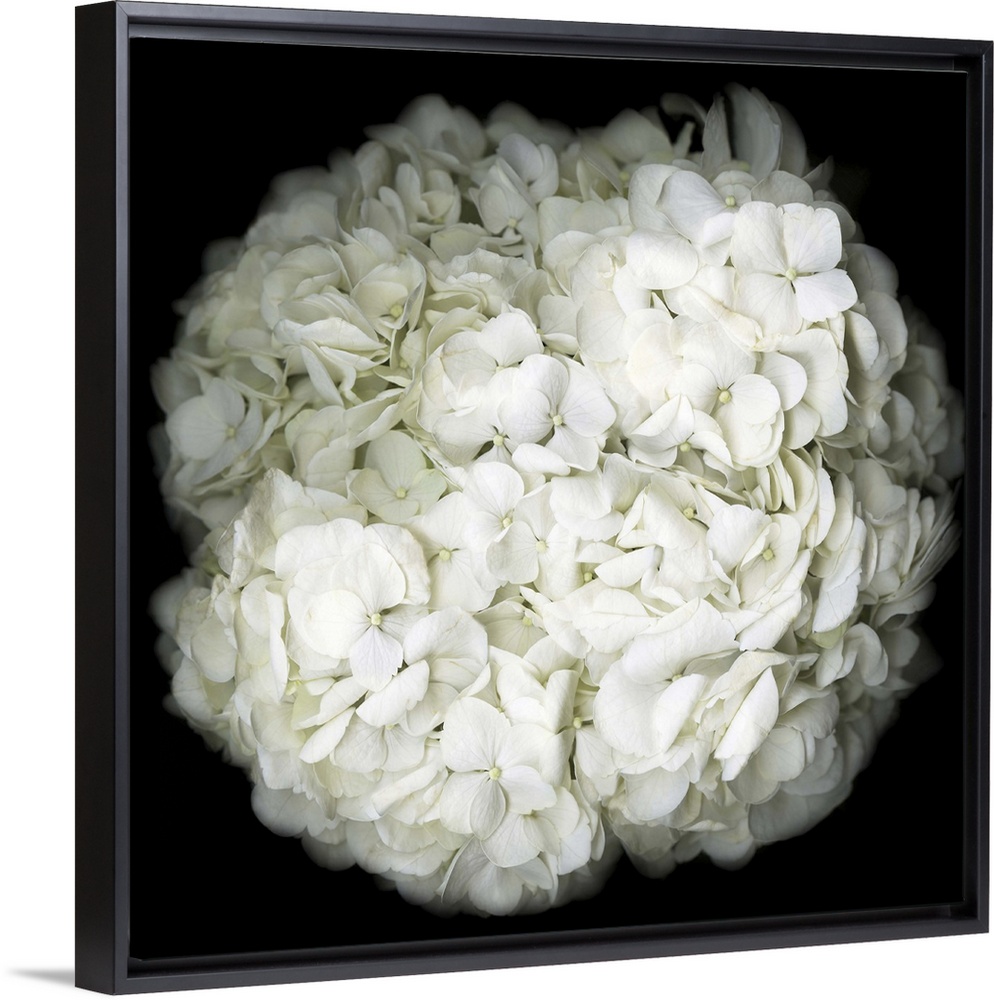 <p>Square photograph of a white Hydrangea close-up on a dark black background.</p>