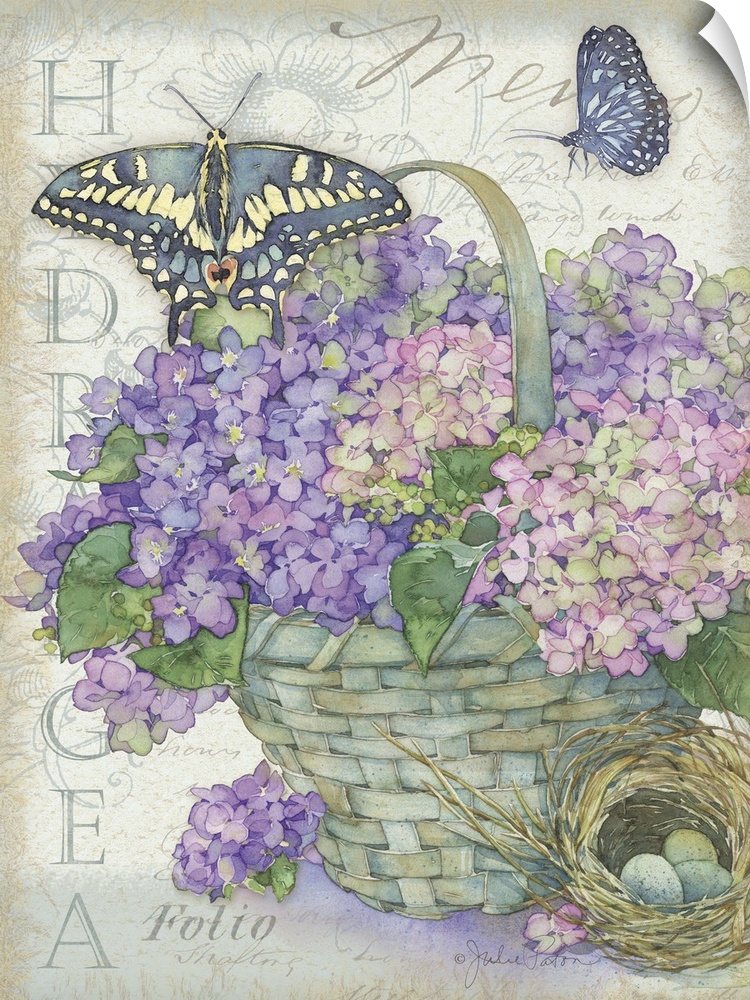 <p>Watercolor painted purple and pink hydrangeas inside a light blue woven basket with two butterflies flying above and a nest with three blue eggs below on a neutral colored background with light blue and gray text and illustrations.</p>