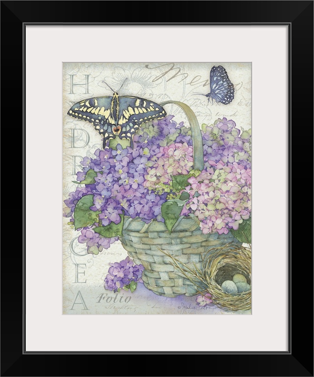 <p>Watercolor painted purple and pink hydrangeas inside a light blue woven basket with two butterflies flying above and a nest with three blue eggs below on a neutral colored background with light blue and gray text and illustrations.</p>
