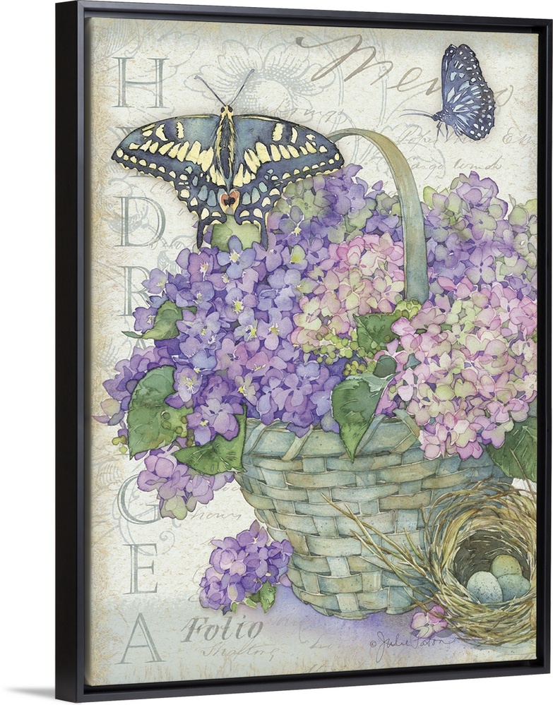<p>Watercolor painted purple and pink hydrangeas inside a light blue woven basket with two butterflies flying above and a nest with three blue eggs below on a neutral colored background with light blue and gray text and illustrations.</p>
