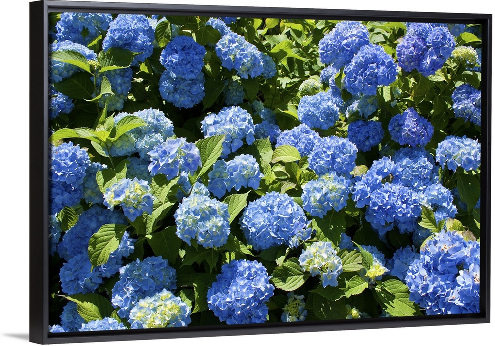 <p>Bunch of blue blooming hydrangea flowers in the spring sunshine.</p>