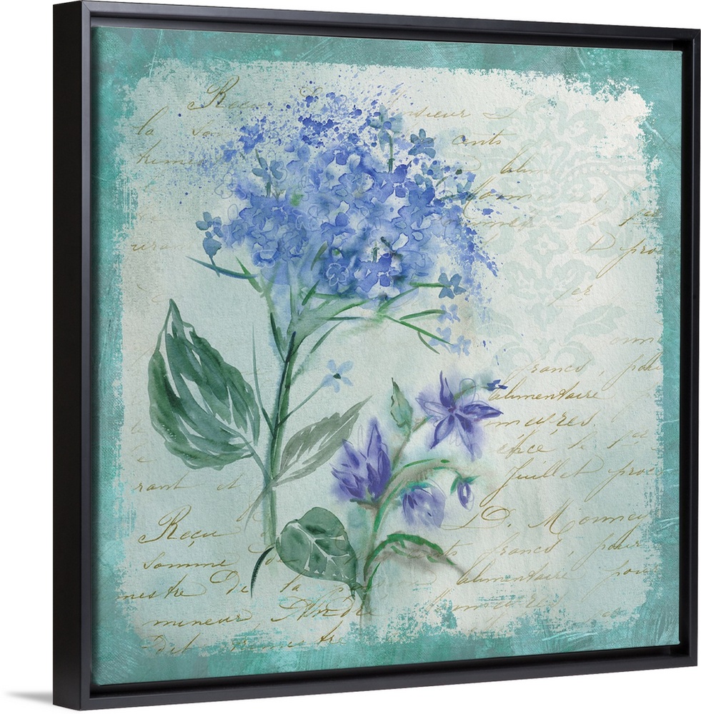 <p>Square decor in cool tones with abstract hydrangeas on a blue bordered background with gold script.</p>
