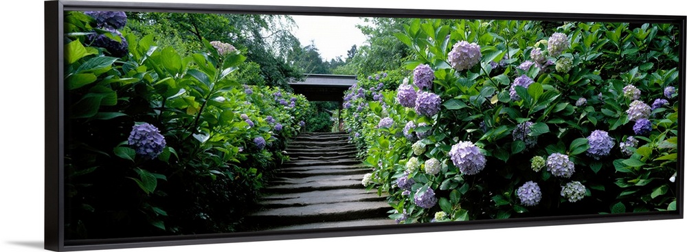 <p>Panoramic photograph of stairway in garden lined with dense greenery and flowers.</p>