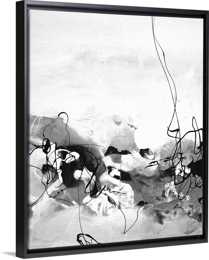 <p>Black, white, and gray contemporary abstract painting with thin black squiggly lines on top of monochrome clusters.</p>