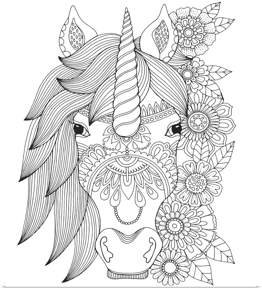 <p>Black and white line art of a unicorn head with a line of flowers flowing down the right side.</p>