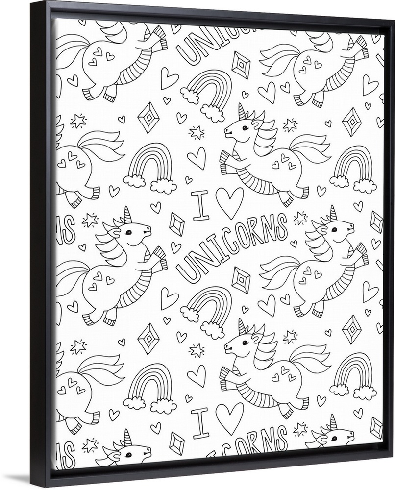 <p>Black and white line art pattern with unicorns, hearts, rainbows, stars, and the phrase "I (heart) Unicorns"</p>