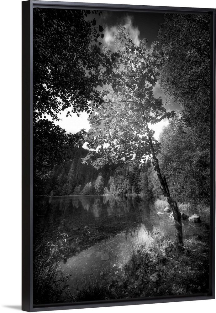 <p>Black and white photograph of a small lake in a forest, concentrating on a single tree along the bank of the water.</p>