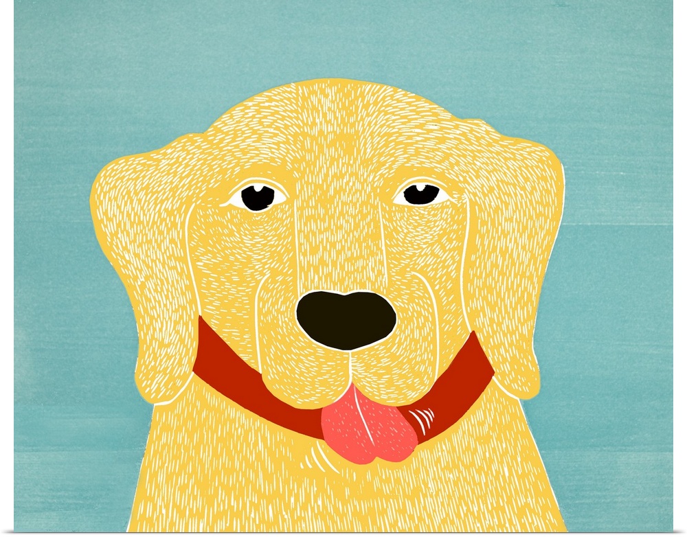 <p>Illustrated portrait of a yellow lab on a blue background.</p>