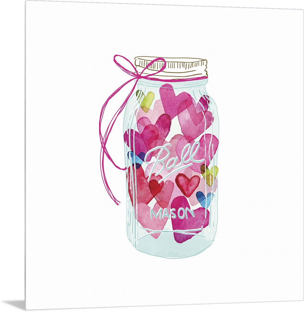 <p>Square watercolor painting of a glass mason jar filled with colorful hearts.</p>