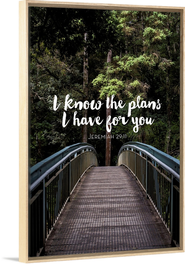 <p>Typography art of a bible verse from Jeremiah 29:11 over an image of a bridge in a forest.</p>