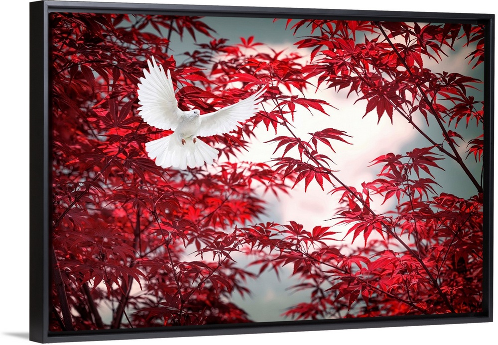 <p>Photograph of a white dove in flight with a red Japanese maple behind.</p>