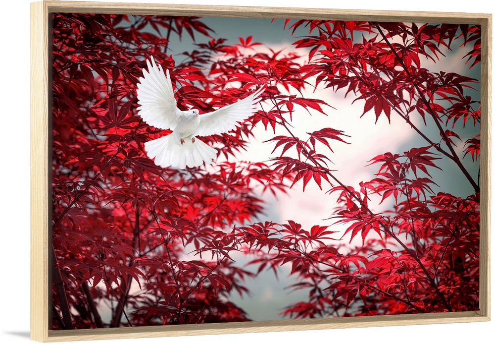 <p>Photograph of a white dove in flight with a red Japanese maple behind.</p>