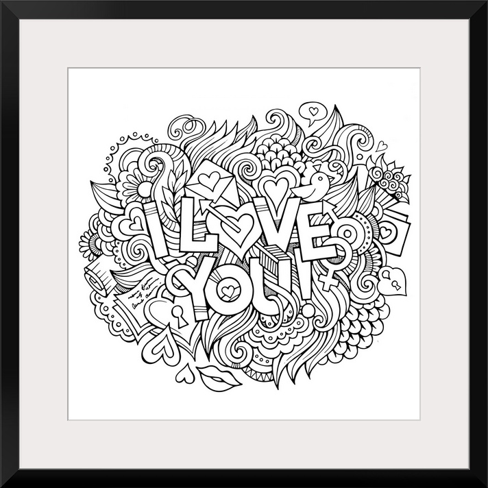 <p>Romantic design featuring hearts and swirls, surrounding the words "I Love You!"</p>