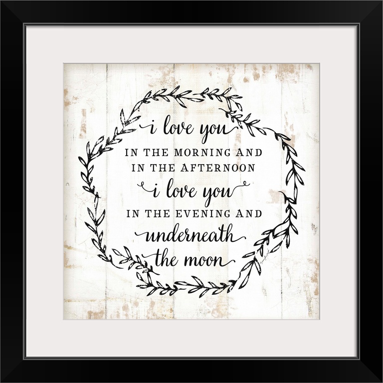 <p>The words, "I love you in the morning and in the afternoon. I love you in the evening and underneath the moon." is black text and placed on a distressed white background.</p>