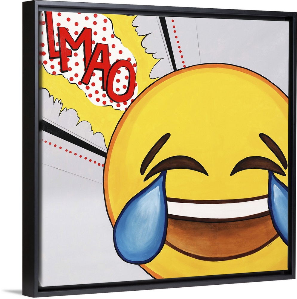 <p>Contemporary painting using a bright yellow pop art style smiley face in tearful laughter.</p>