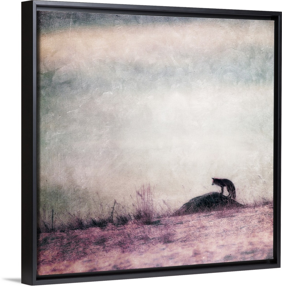 <p>An artistic photograph of a silhouetted fox standing on a rock on purple field.</p>