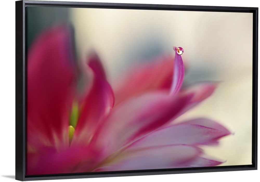 <p>Soft focus macro image of a dew drop on red flower petals.</p>