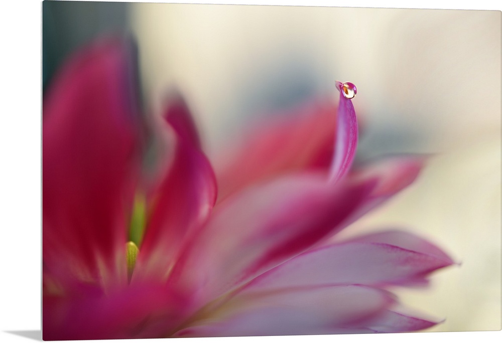 <p>Soft focus macro image of a dew drop on red flower petals.</p>