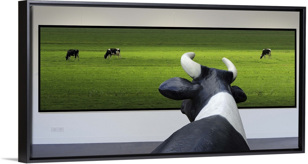 <p>Conceptual image of a cow looking at a framed photo of other cows in a green field.</p>