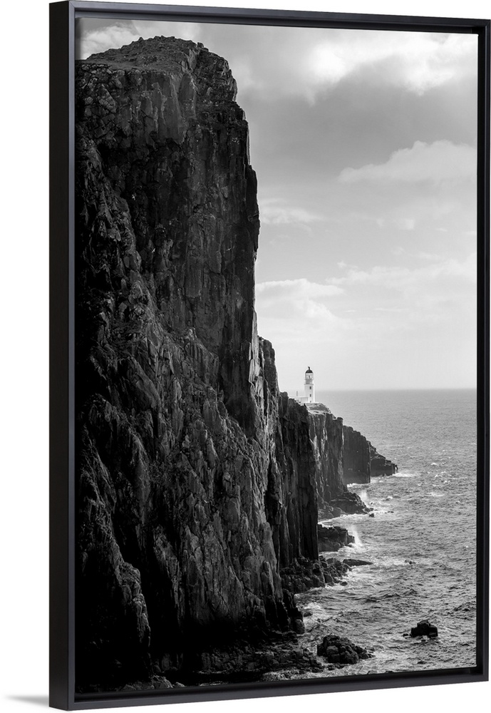 <p>Fine art photo of a steep ocean cliff with rocks below, in black and white.</p>