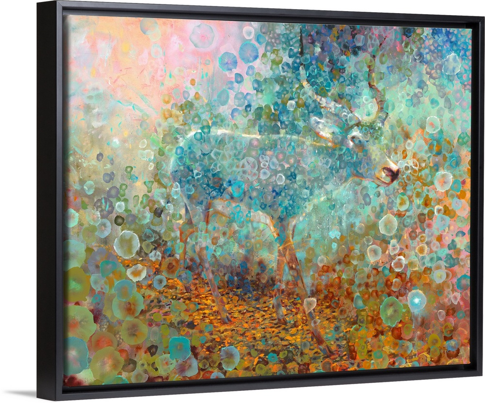 <p>Brightly colored contemporary artwork of a deer walking alone.</p>