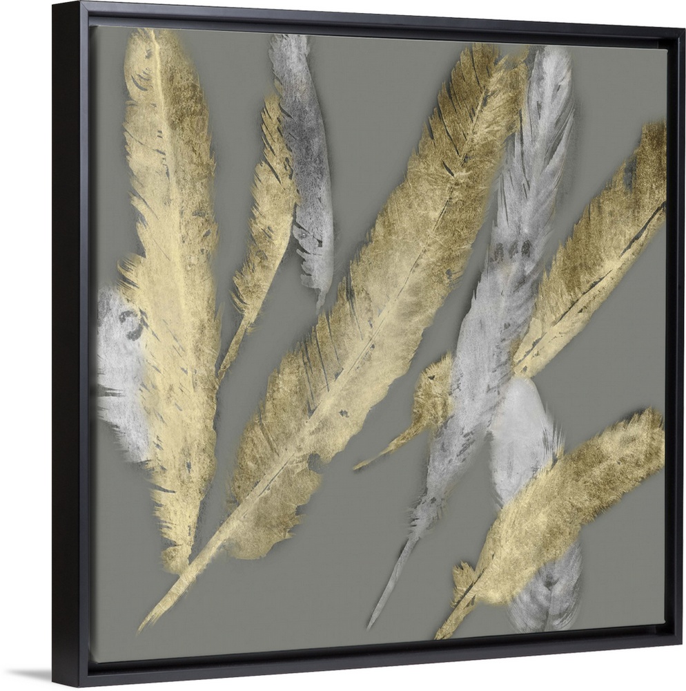 <p>Contemporary home decor artwork of gold and silver feathers fluttering against a gray background.</p>