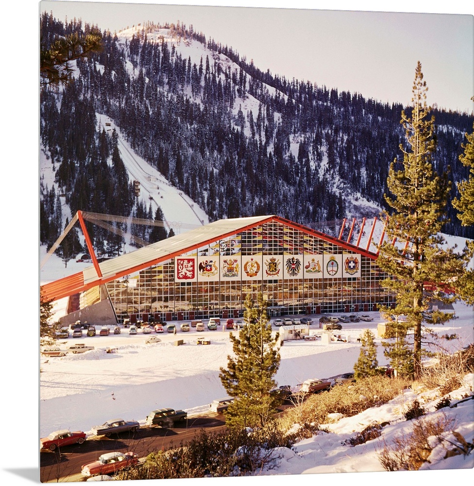 <p>Squaw Valley, CA.: Ice arena to be used in 1960 Winter Olympics showing colorful panels of participating nations.</p>