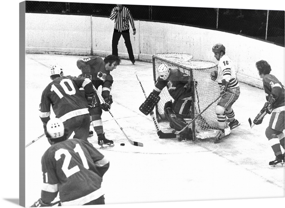 <p>circa 1973 A view of the ice hockey match between the London Lions and the Prague All Stars held at the Wembley Arena The London Lions netminder, Leix Holmouist is helped by team mates as the solitary Prague right wing Millos Novak (16) attempts to get</p>