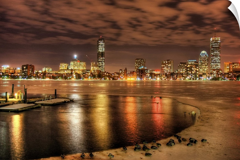 <p>Ice partially melted on Charles River in Boston. Ducks in foreground, boat dock and Boston skyline.</p>