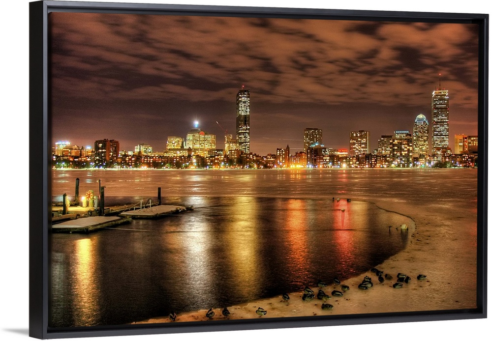 <p>Ice partially melted on Charles River in Boston. Ducks in foreground, boat dock and Boston skyline.</p>
